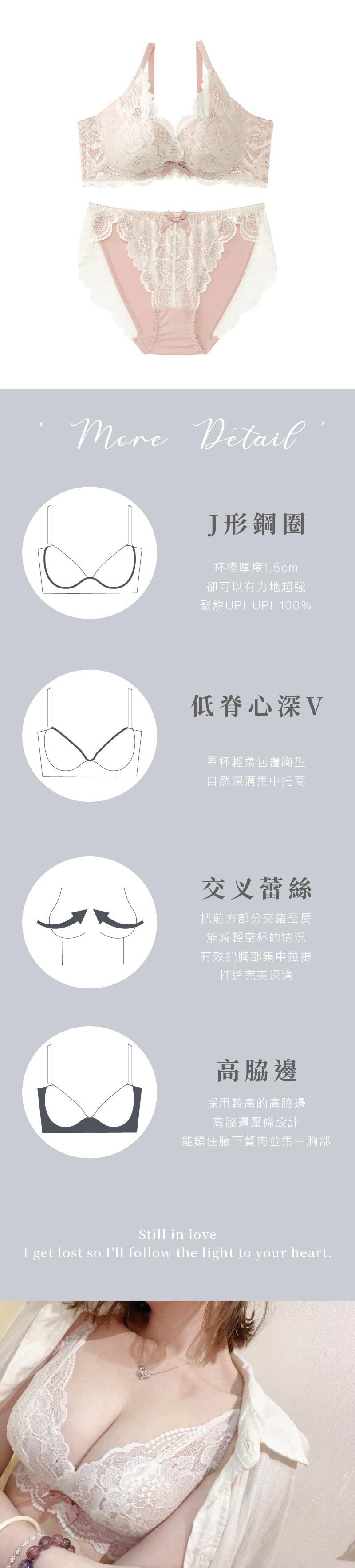 採用了蕾絲則由罩杯覆蓋至肩帶部分 達到拉提的作用