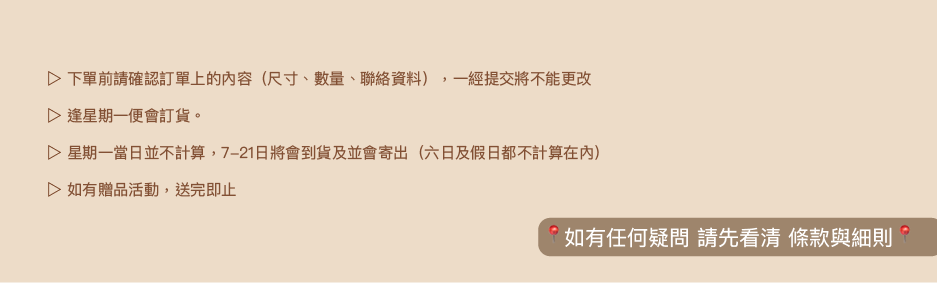 為了保障本店及買家的權益,如果客對條例有任何不明白、不清楚或不了解請向客服查詢並請客人仔細閱讀條例,理解及同意的情況之下,進行下單及購買